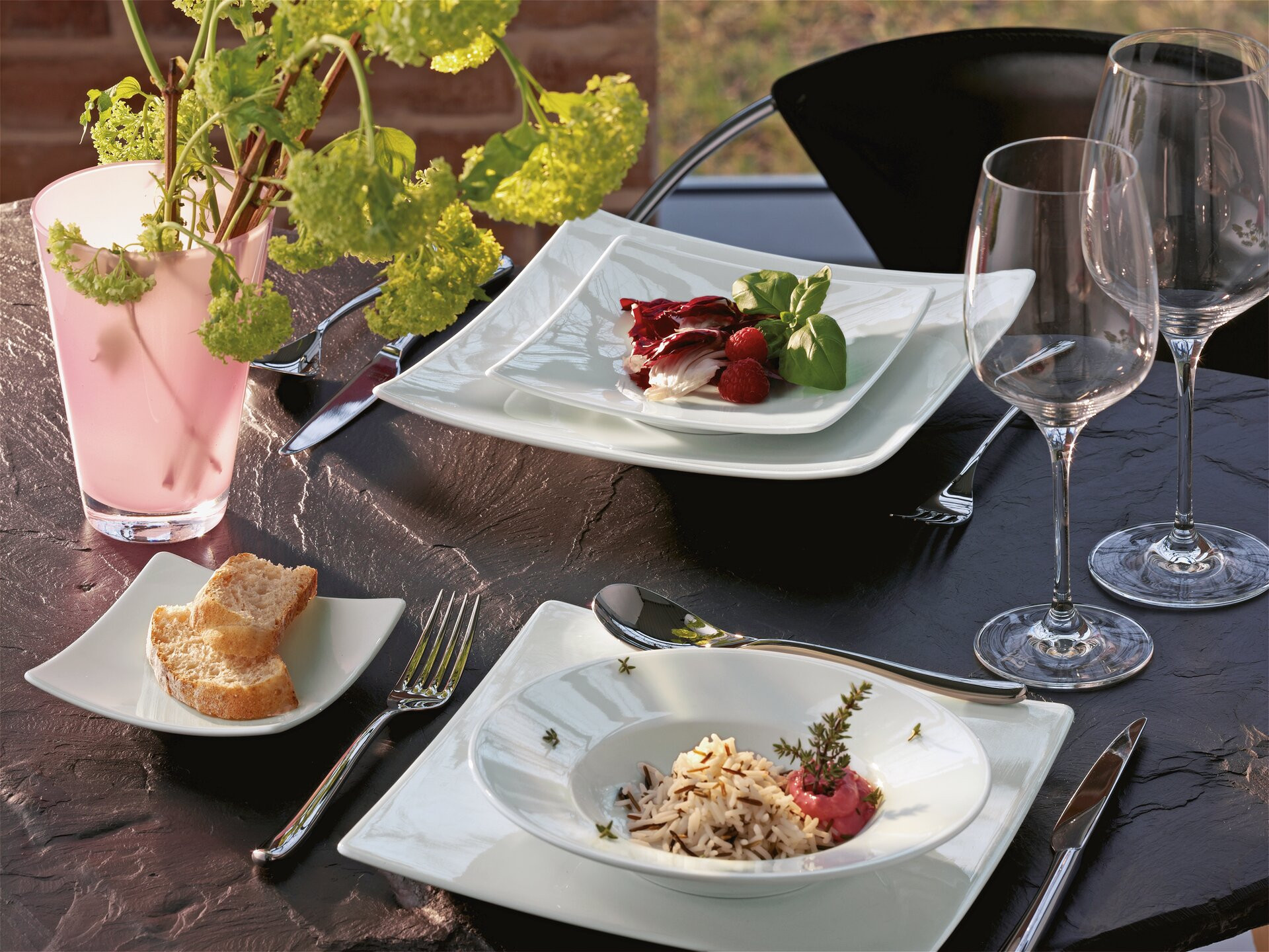 Klassische Eleganz – in einer klaren, zeitlosen Form. Der besondere Charme liegt in der Kombination aus runden und quadratischen Tellern und weich geschwungenen Hohlteilen. Ein anmutiger Purismus, der ganz unterschiedliche Ansprüche befriedigt.