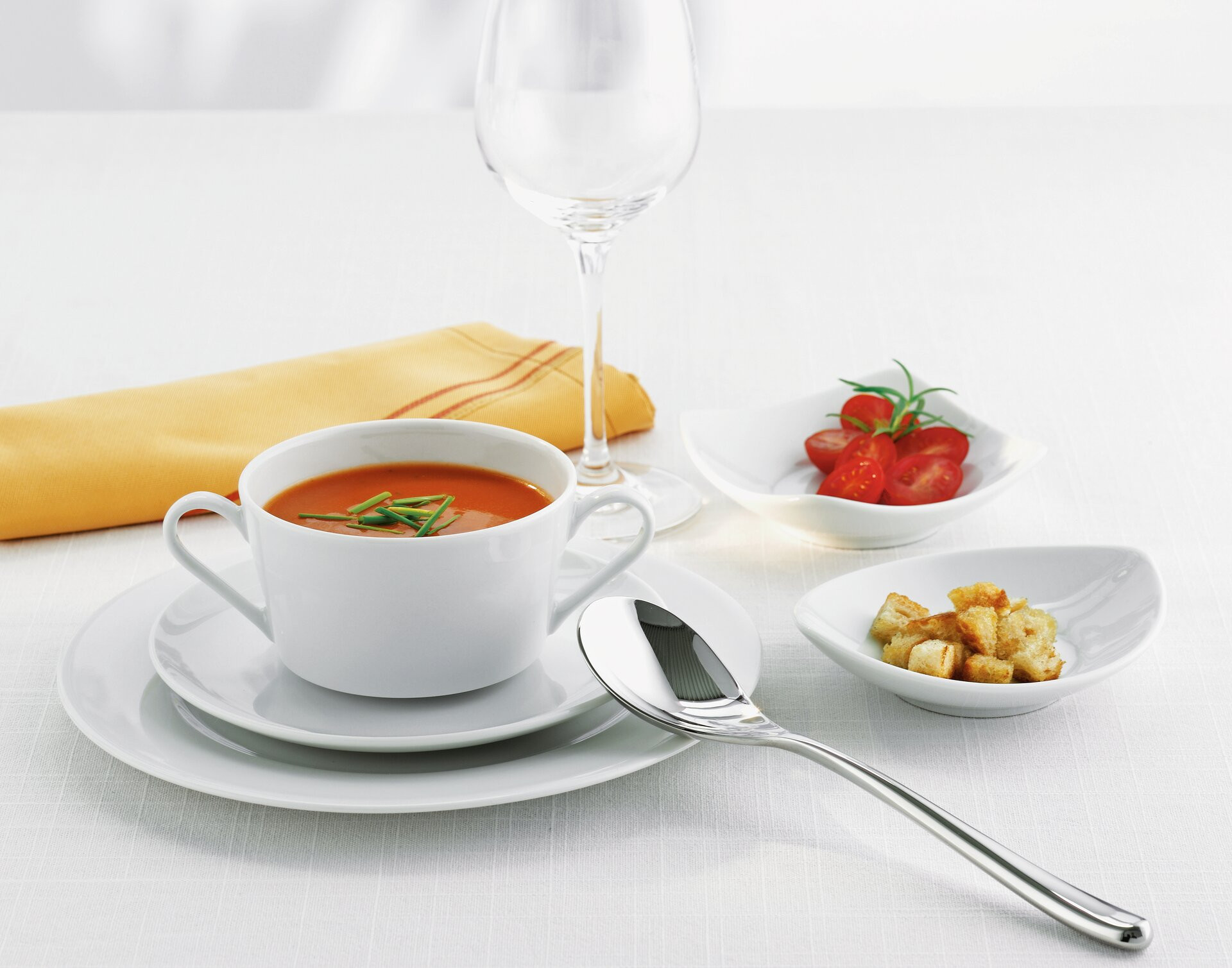Klassische Eleganz – in einer klaren, zeitlosen Form. Der besondere Charme liegt in der Kombination aus runden und quadratischen Tellern und weich geschwungenen Hohlteilen. Ein anmutiger Purismus, der ganz unterschiedliche Ansprüche befriedigt.