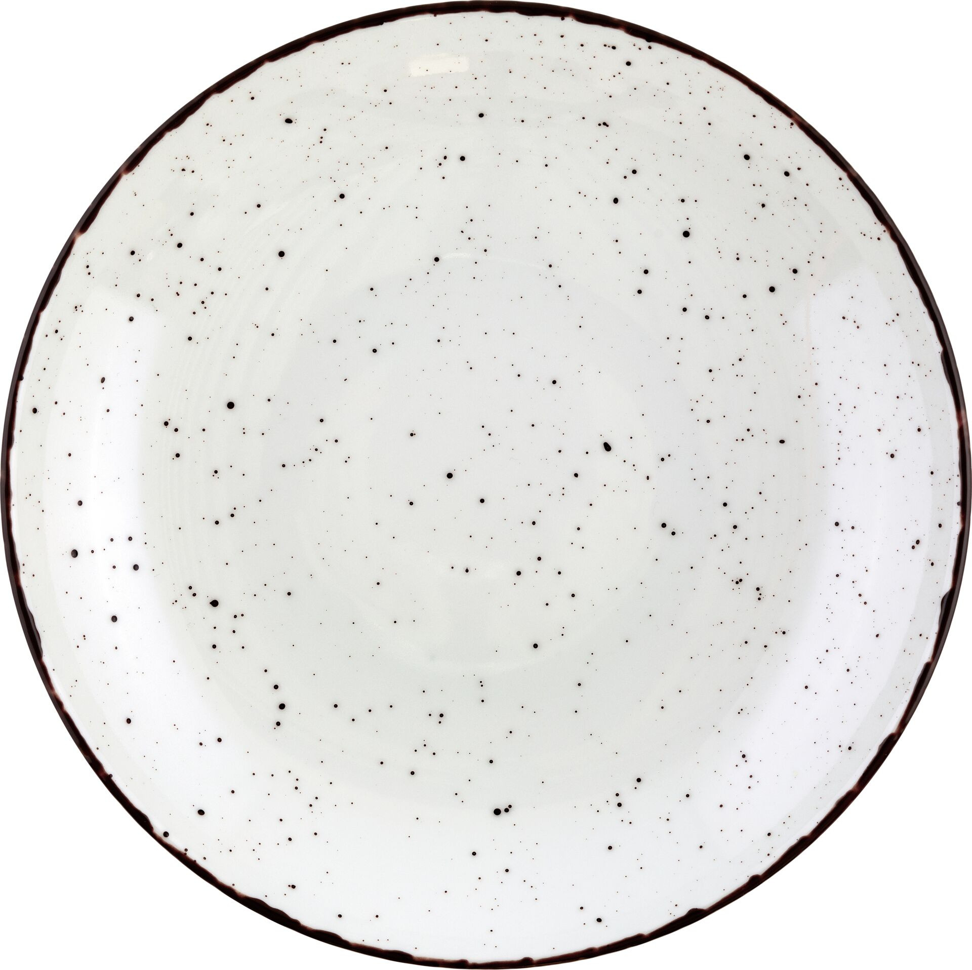 Porzellan. Grundfarbe weiß, Rand braun und Spiegel braun gesprenkelt. Mischsortierung. Spülmaschinengeeignet.