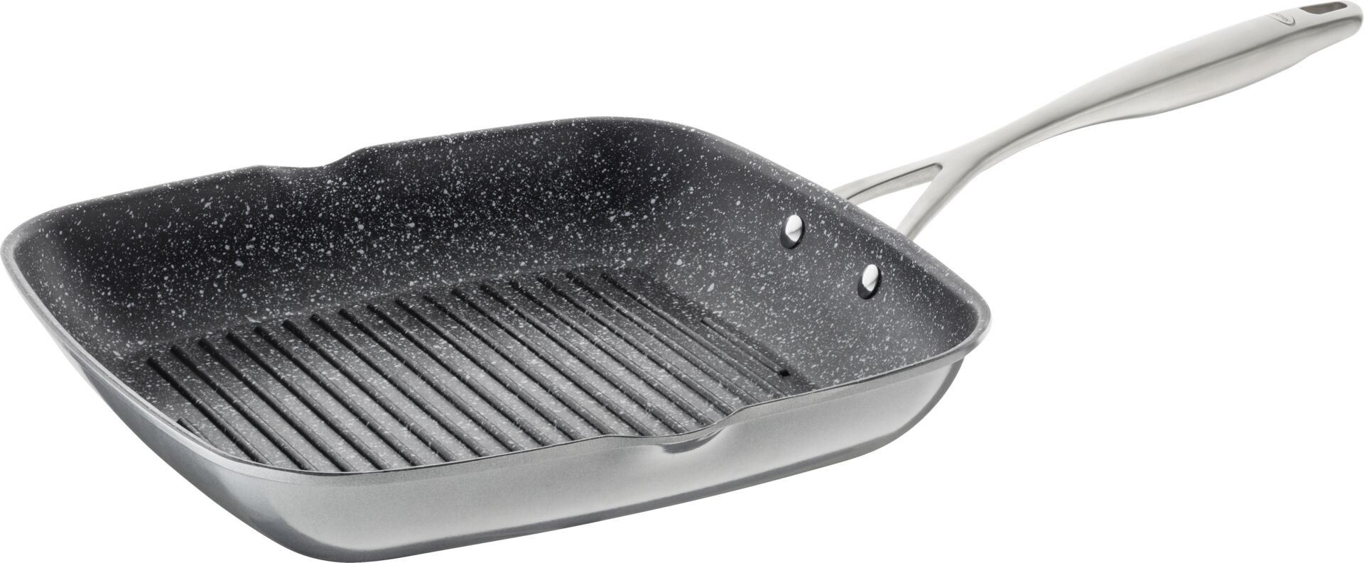 Aluguss. Antihaft. Bodenstärke: 4,5mm. Mit 2 Ausgüssen. Robuste, harte und kratzfeste Beschichtung, gesund und fettfrei Braten wie auf Naturstein, schnelle und gleichmäßige Wärmeübertragung, Hitzebeständig bis 220 C°. Kaltgriff mit Logo Cookmax, für alle Herdarten geeignet, auch Induktion.