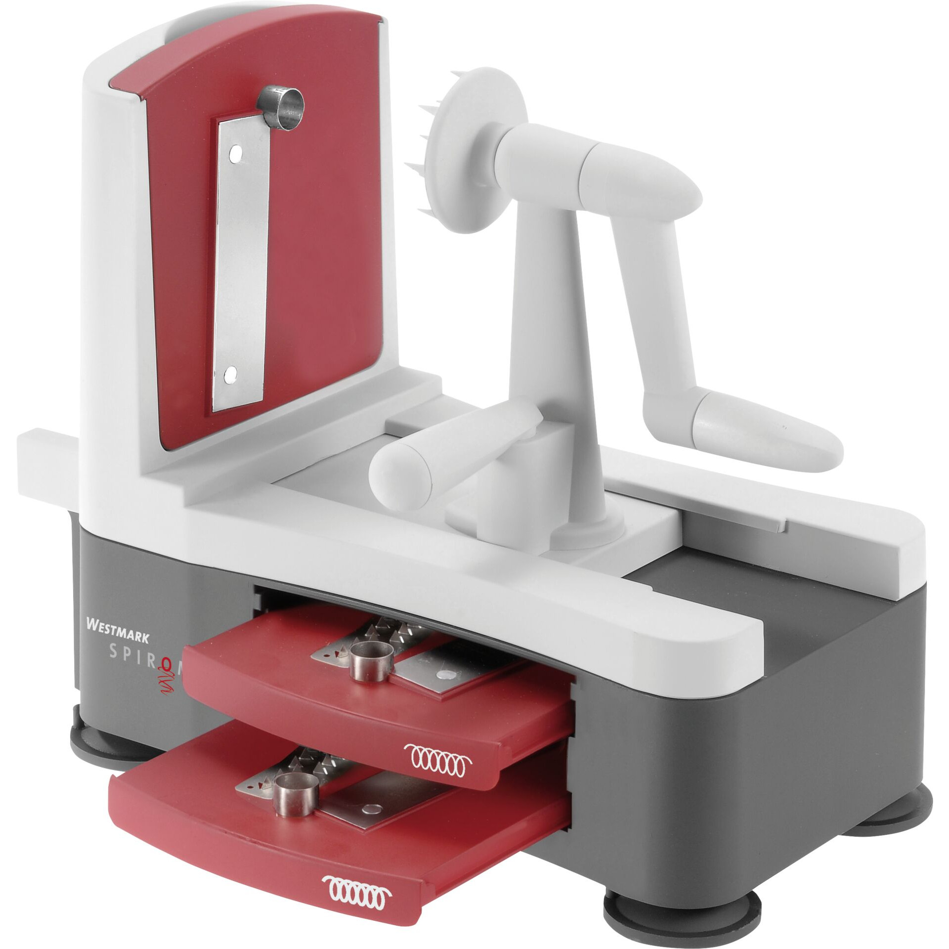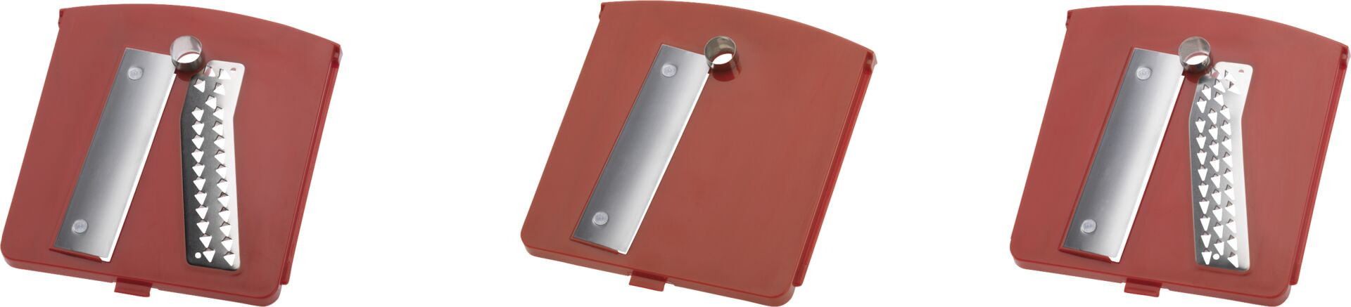 ABS, Edelstahl. Für Obst und Gemüse. 3 sehr scharfe Klingen-Einsätze sorgen für Abwechslung. Praktisch: die jeweils nicht genutzten Schneideinsätze werden schubladenförmig in das Gerät eingesteckt. 4 Gummi-Saugfüße für festen Halt. Spülmaschinengeeignet.