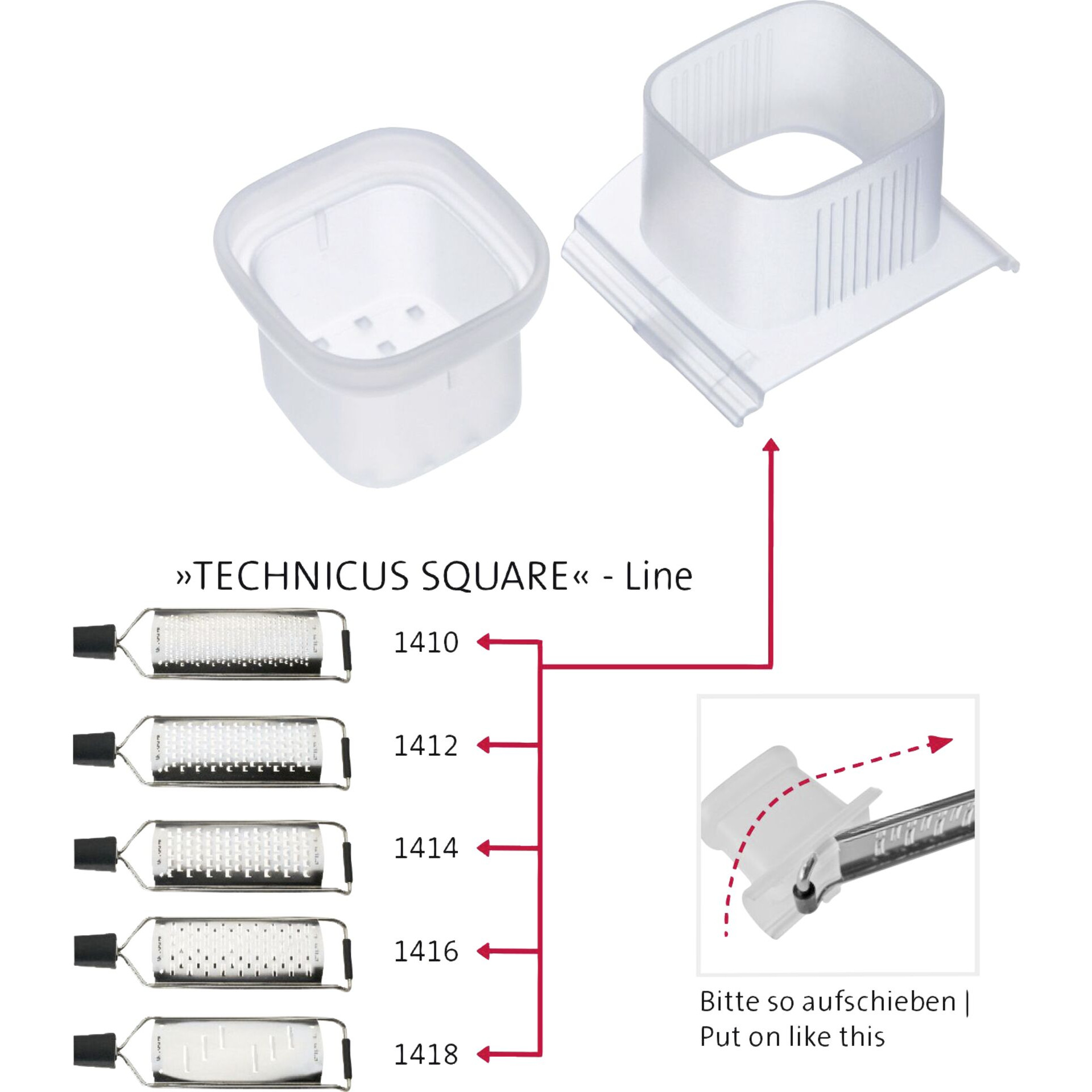 PP, schützt die Finger und ermöglicht ein gefahrloses Reiben auch von sehr kleinen Stücken, spülmaschinengeeignet.