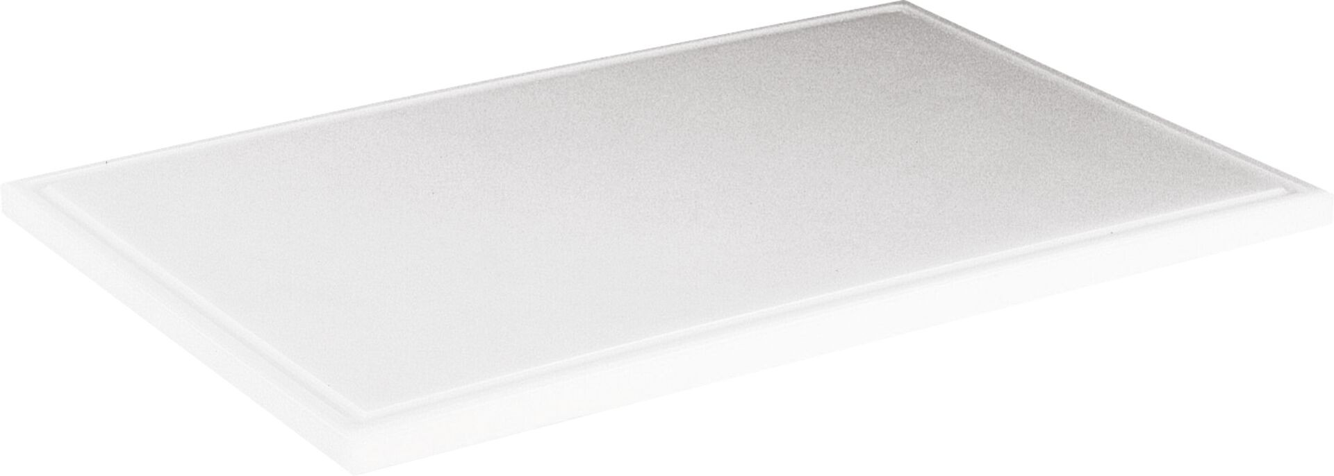 PE 500, mit Saftrille und Antirutsch-Füßchen. Stärke 2 cm. Bis 80°C temperaturbeständig. Schneidbretter dürfen beim Spülvorgang nicht geklemmt werden. Keine heißen Gefäße aufstellen, kann zum Verziehen der Platten führen.